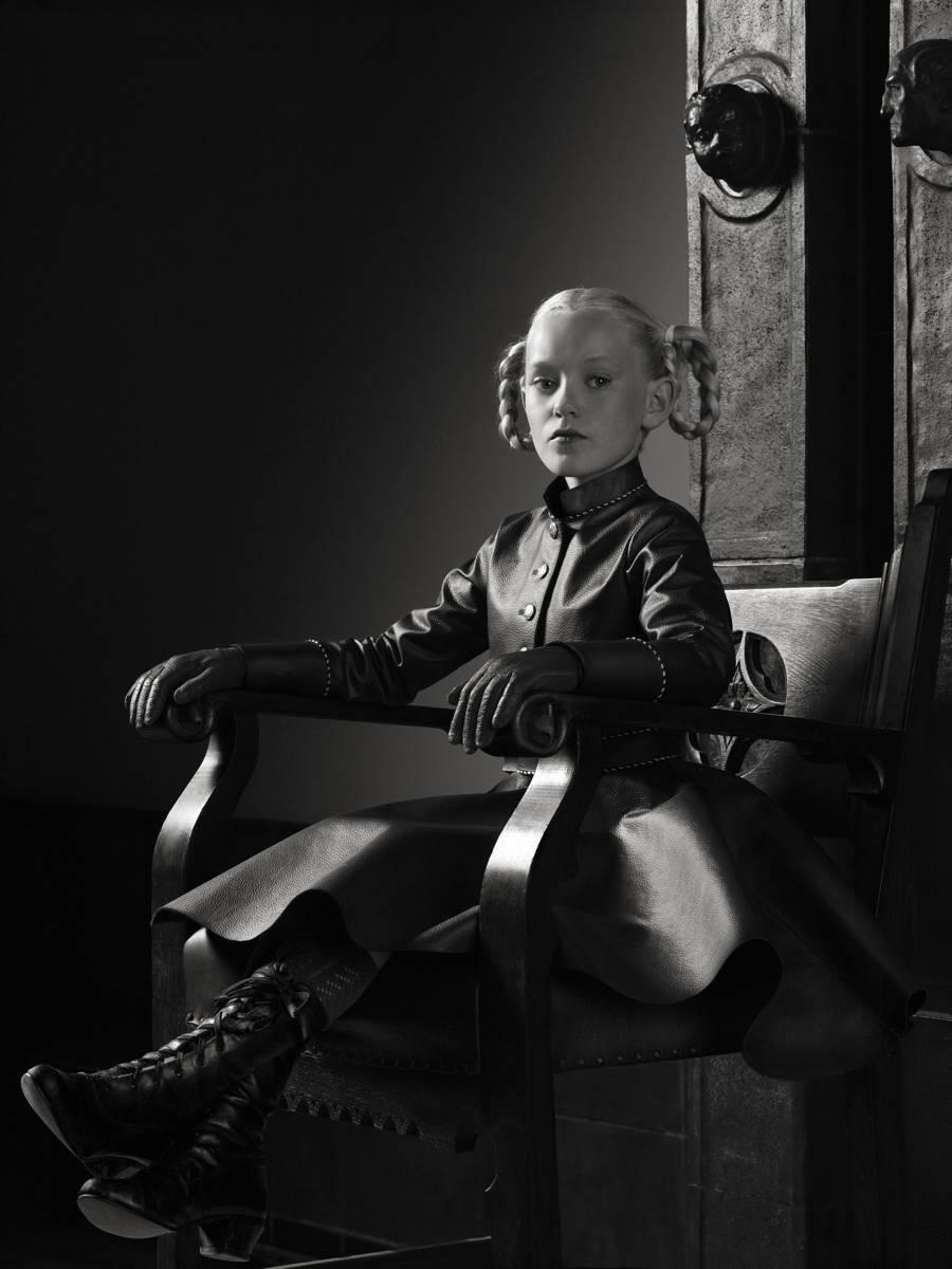 Erwin Olaf steeps the scenes in his carbon prints in dark monochromatic tones, conjuring historical-seeming backgrounds against which persons and objects stand out in relief form. For his Berlin series, he took photographs in the former sport arenas of the 1936 Olympic games and created strange tableaus featuring odd figures in the restored interior of the Logenhaus Berlin, including children in leather uniforms, a muscular African American decorated with medals, and an older, witch-like woman. To us, the images evoke a bleak and distant world in which children and old people alike are evil: aggressive, smug, and malevolent – the descendants of Nazis. Originally, the African American track athlete Jesse Owens refused to take part in the 1936 Olympic games in protest against the discrimination of Jews and people of colour in Germany. In the end, he won four gold medals, became the most successful athlete of the Olympics, and threw a wrench into the carefully planned orchestration of Aryan superiority.